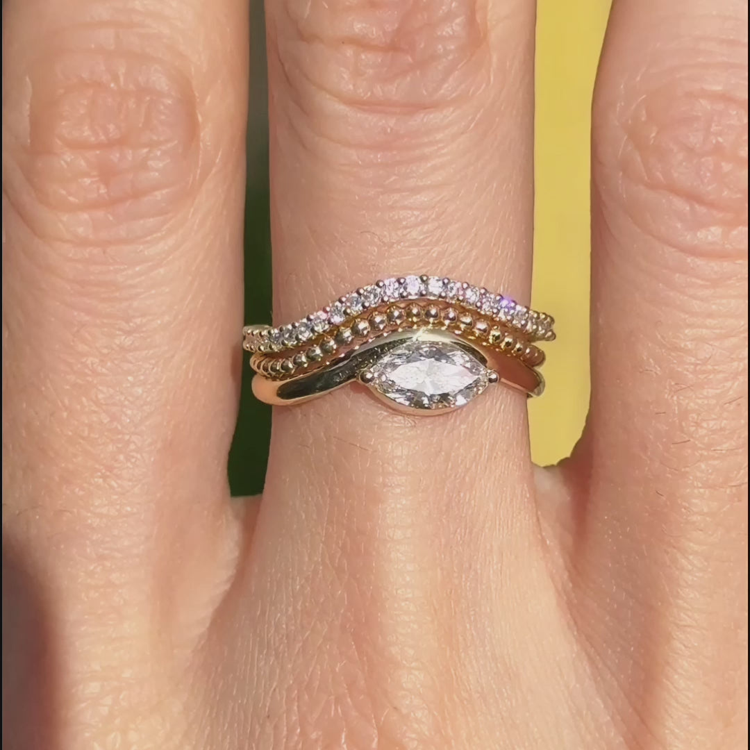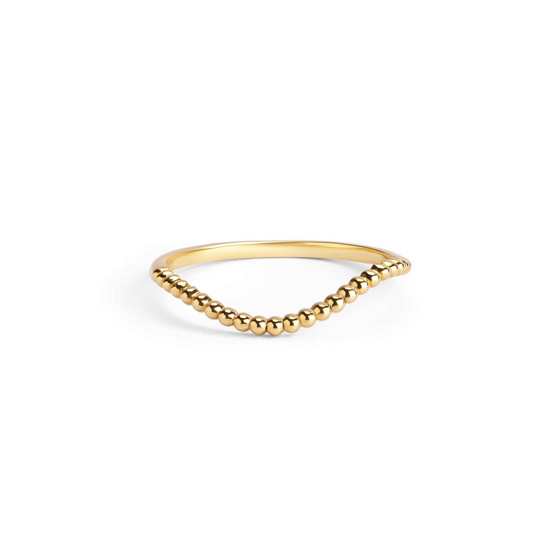 The Beadline Ring is defined by a continuous row of polished gold beads, creating rhythm, texture, and subtle dimension. Minimal yet expressive, the design plays with light through form rather than stones.