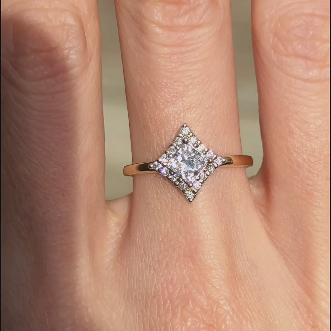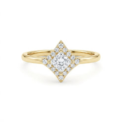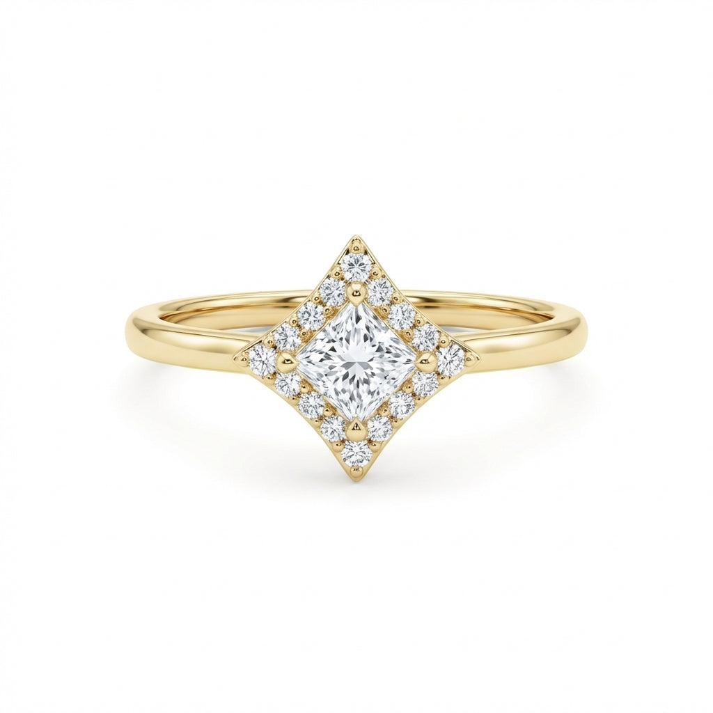 The Inframe Ring offers a refined take on a halo design, drawing subtle inspiration from Art Deco geometry. A 0.55ct princess-cut white diamond sits at the center, framed by a delicate arrangement of round diamonds that highlights structure and proportion.