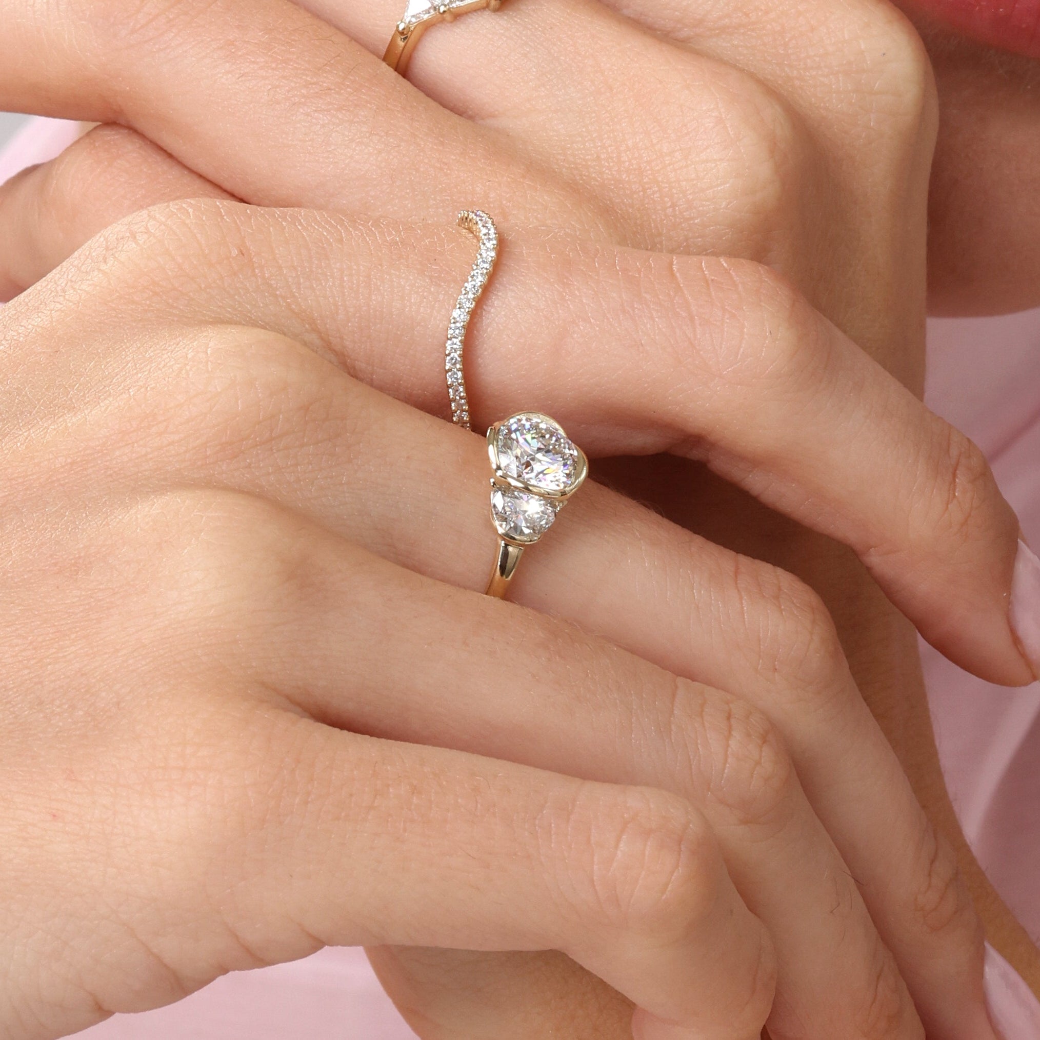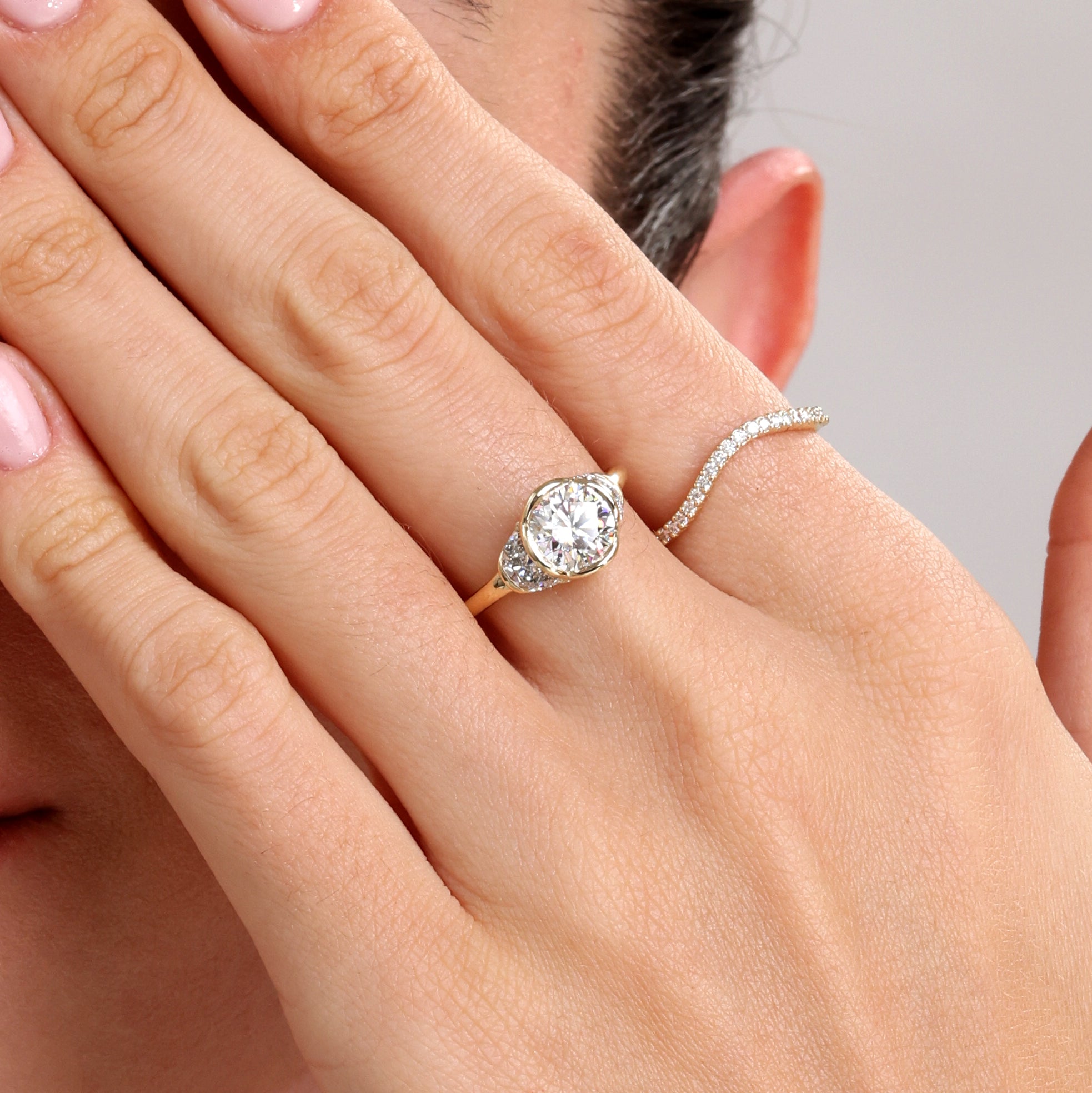 A luminous 1.5ct round diamond anchors the design, flanked by sculptural half-moon stones that create a sense of flow and balance. Soft gold curves wrap the stones, giving the ring a fluid, contemporary feel. Bold yet elegant, it’s a non-traditional engagement ring made for those who want something substantial, confident, and unmistakably modern.