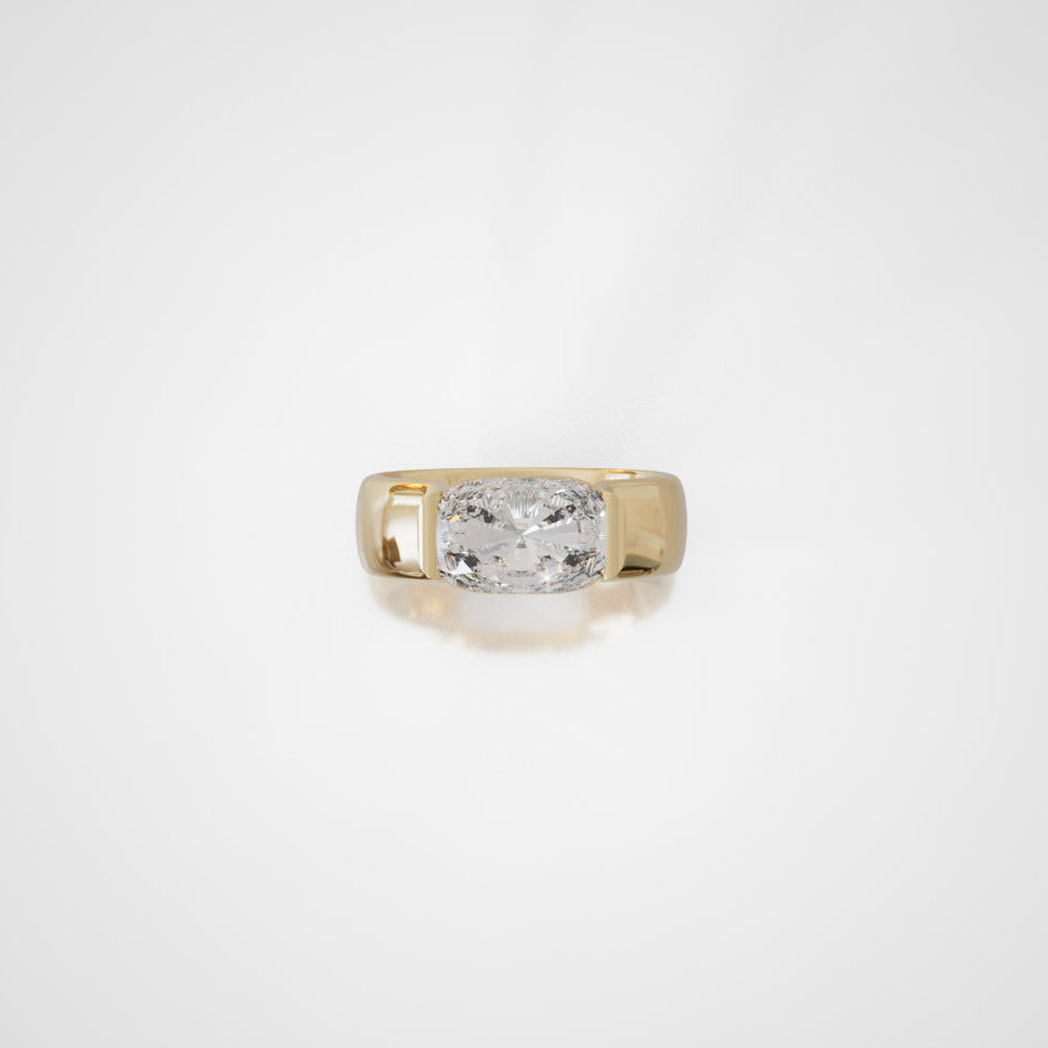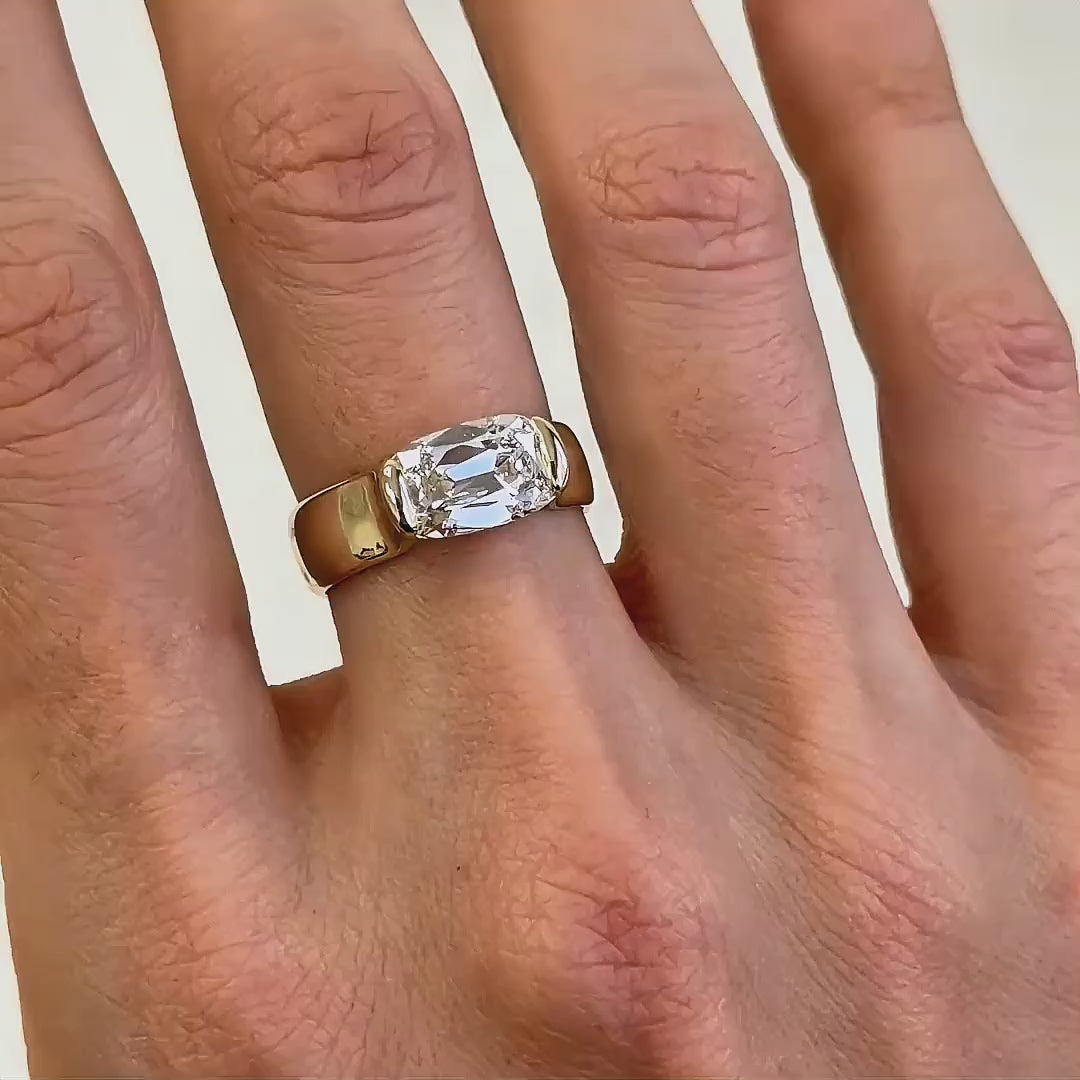 Contemporary engagement ring set with a 2ct Old Mine cushion cut diamond.