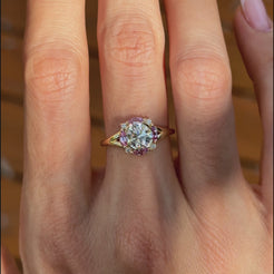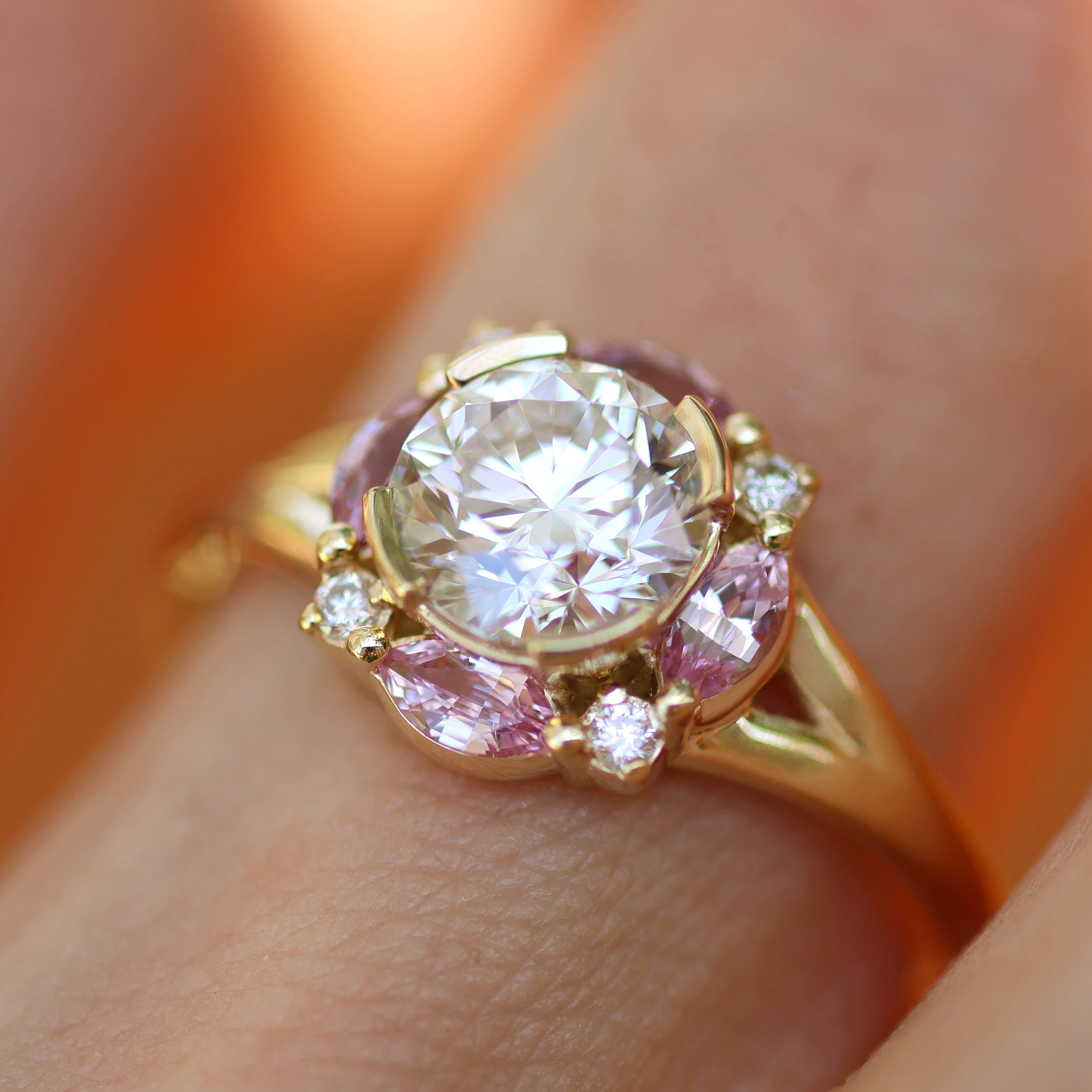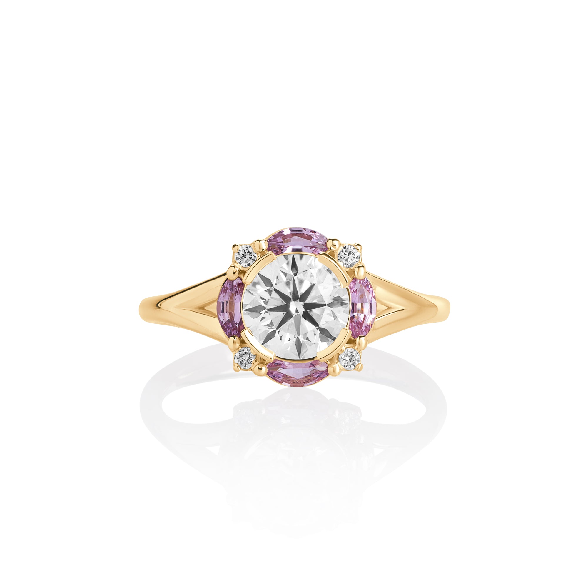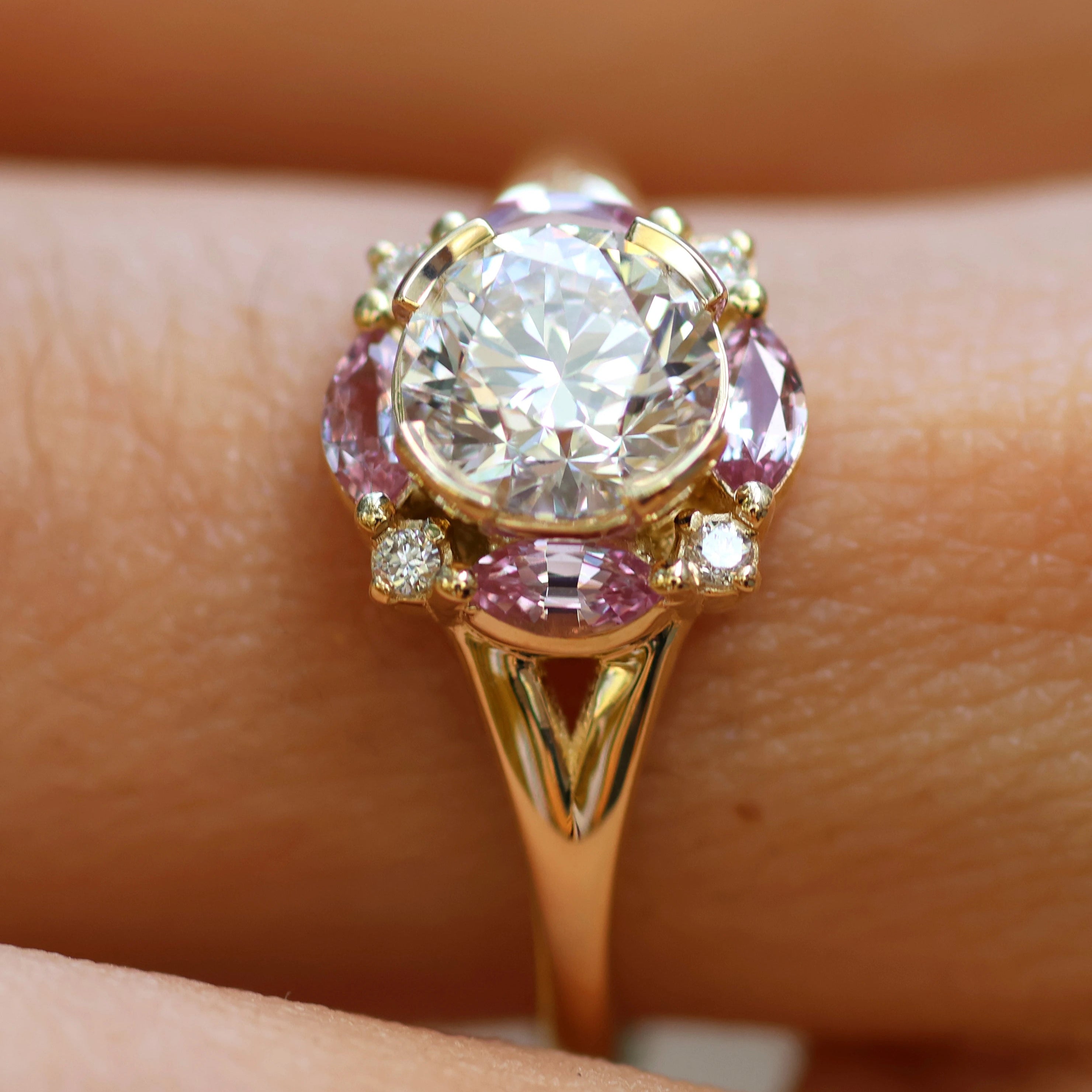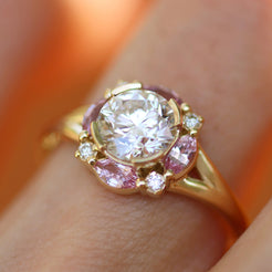 The Petal Crown Ring is a celebration of color and brilliance. At its heart, a 1ct round diamond radiates with timeless sparkle, framed by marquise-cut natural pink sapphires that bloom like petals around the stone. Delicate accent diamonds complete the crown-like halo, enhancing its light and symmetry.