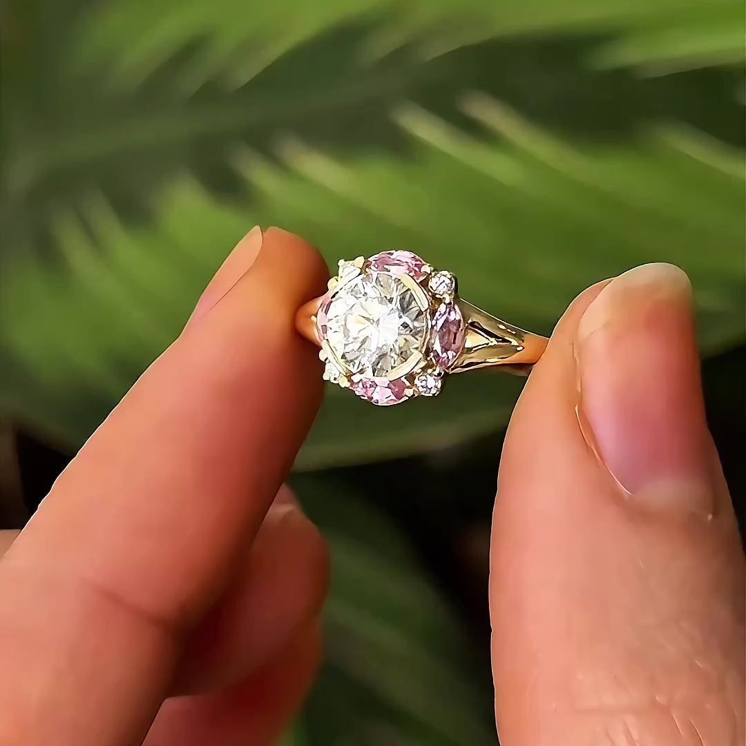 The Petal Crown Ring is a celebration of color and brilliance. At its heart, a 1ct round diamond radiates with timeless sparkle, framed by marquise-cut natural pink sapphires that bloom like petals around the stone. Delicate accent diamonds complete the crown-like halo, enhancing its light and symmetry.