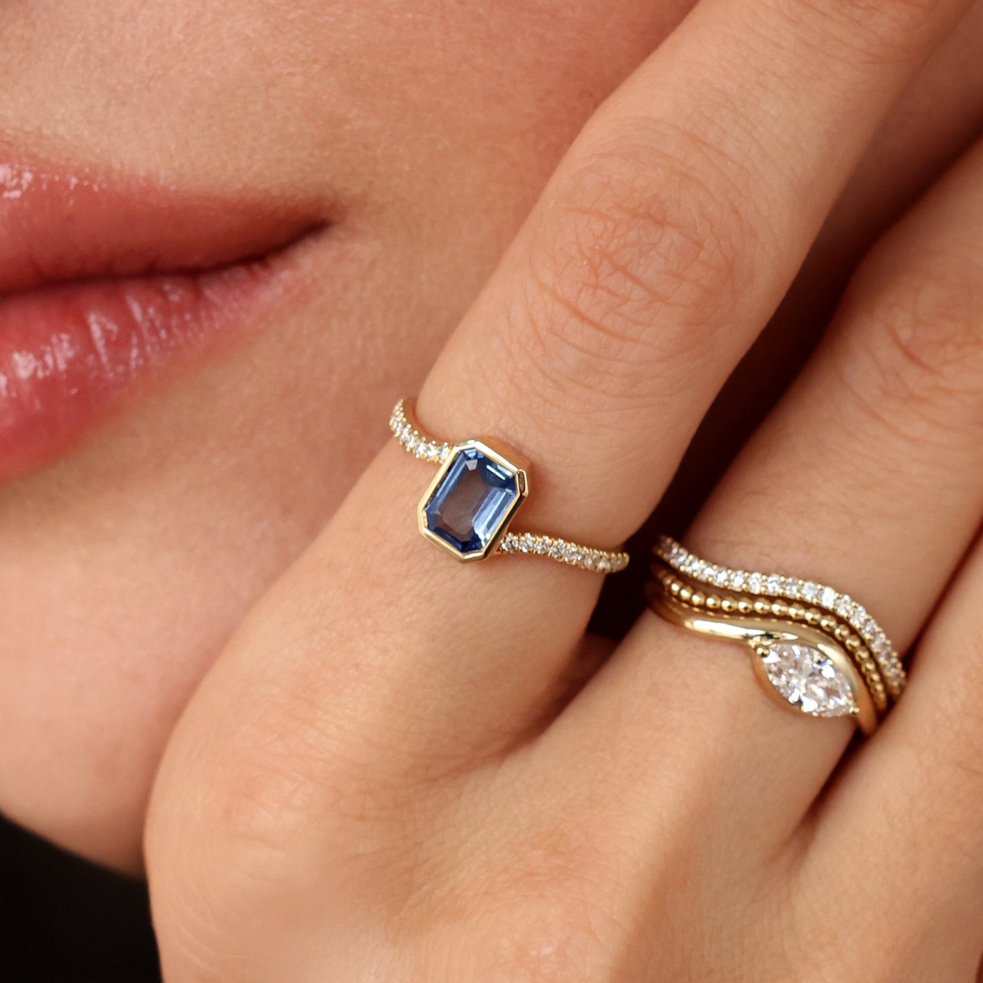 The Reprise Sapphire Ring centers on a 0.85ct emerald-cut blue sapphire, set within a clean gold frame that highlights its depth and color. Delicate diamond accents along the band add light and contrast while maintaining a refined, balanced feel.