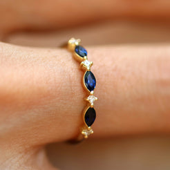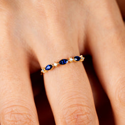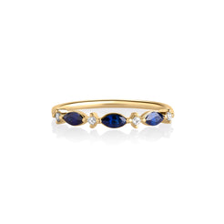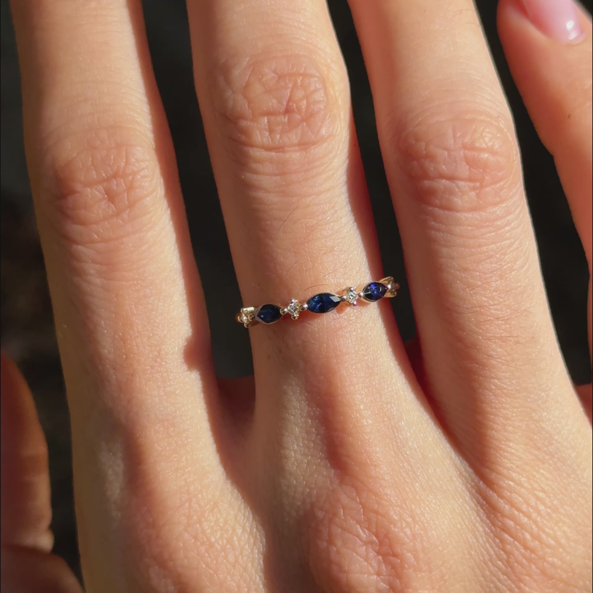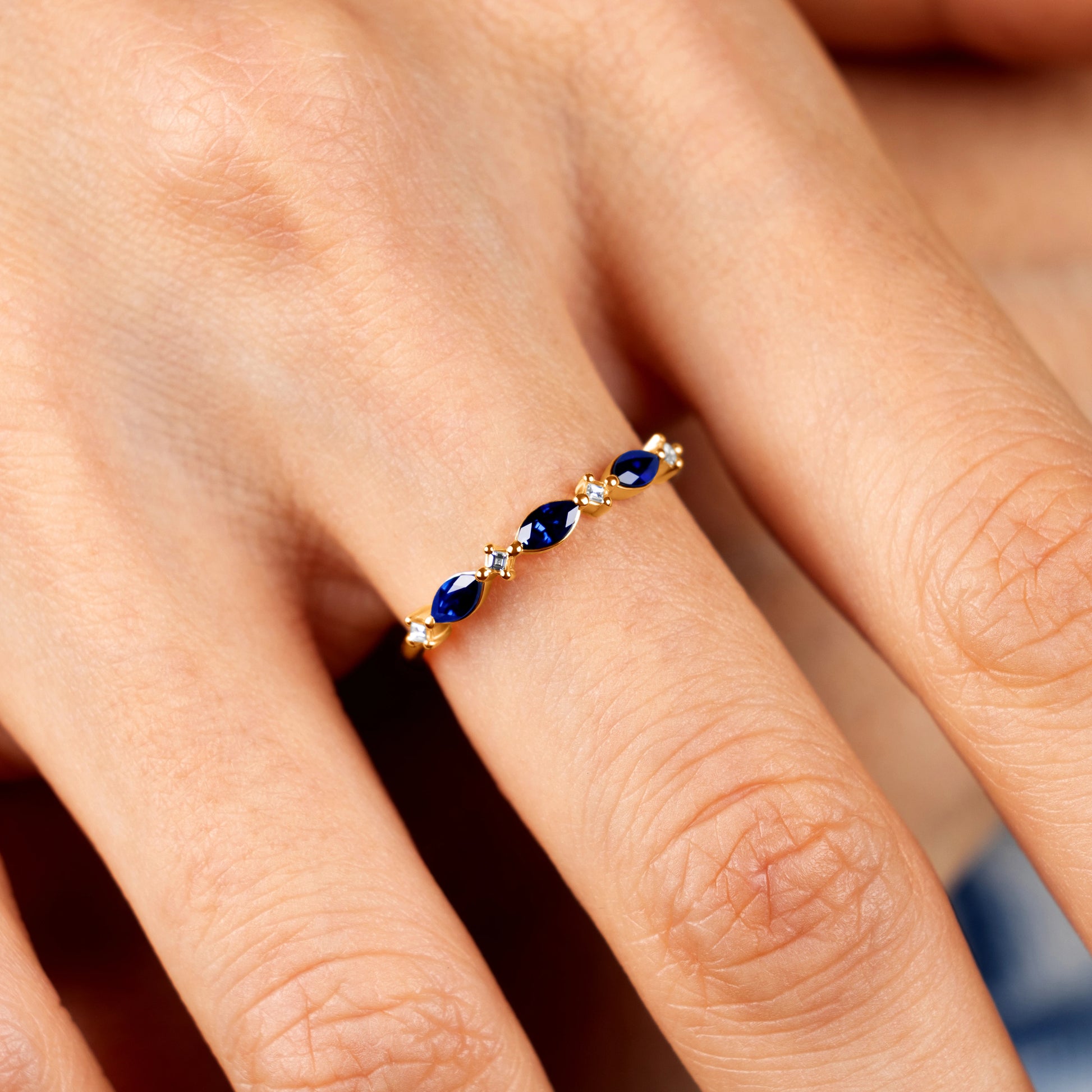 A ring that captures the night sky. The Starlight Sapphire Ring features natural, no-heat royal blue marquise sapphires alongside carré-cut lab-grown white diamonds, their contrast evoking stars shimmering against deep midnight.