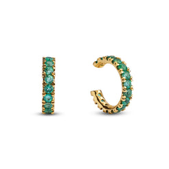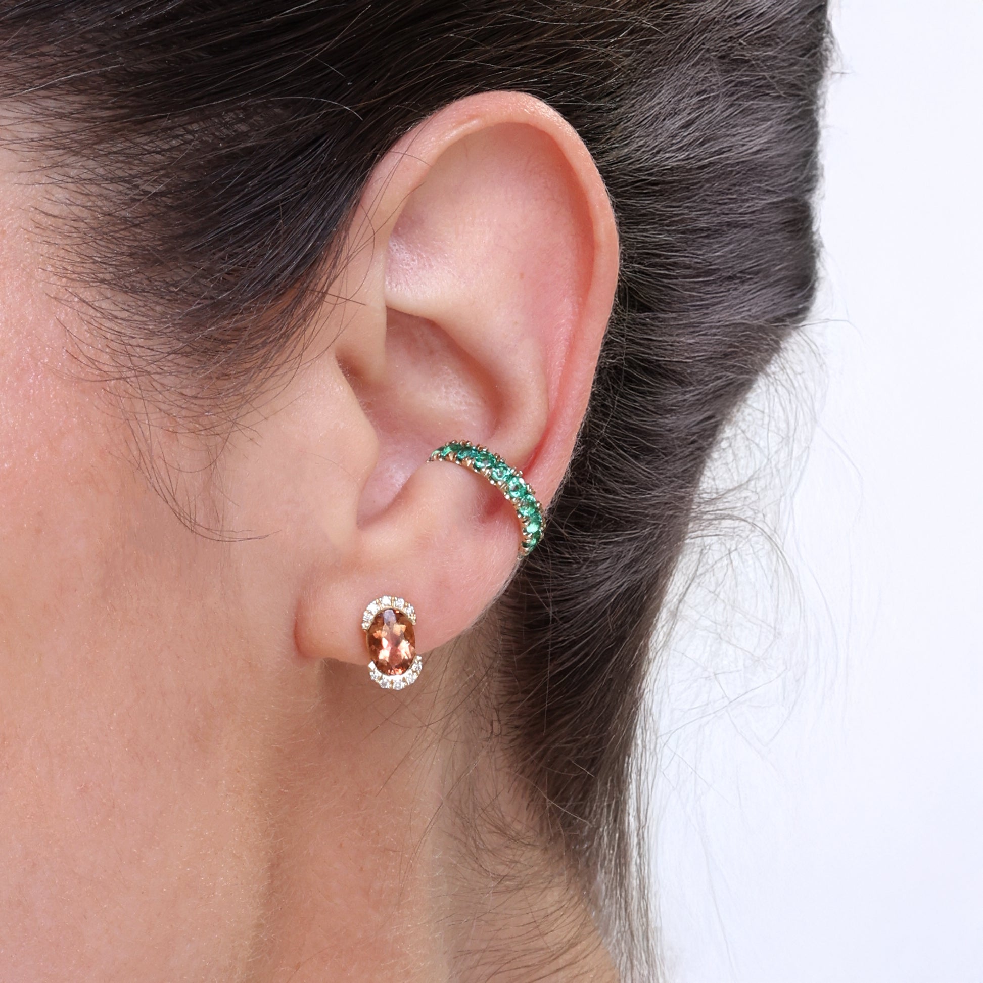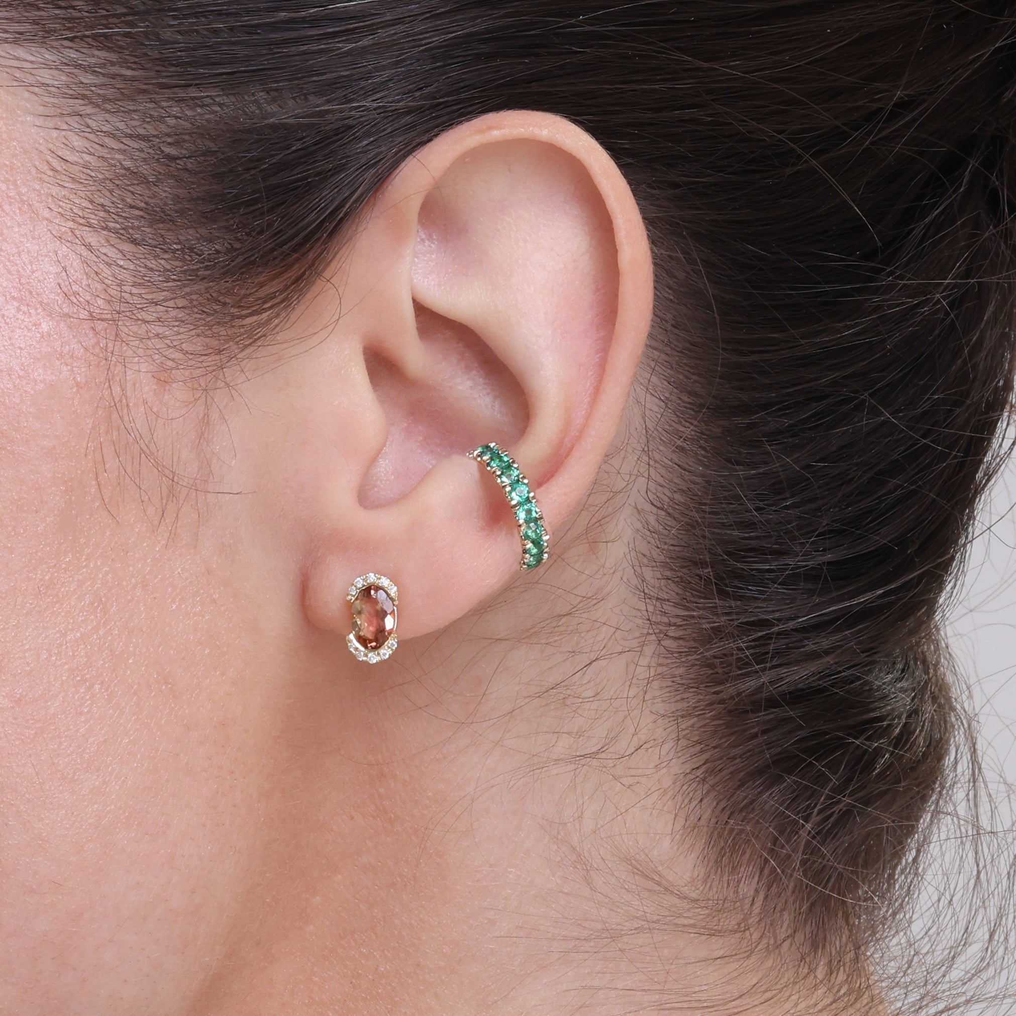 The Verdeline Cuff is designed as a refined accent with a strong sense of color. Set with natural emeralds, it wraps the ear in a continuous line of green, balancing softness with presence. Wear it alone as a subtle statement or layer it with hoops and studs for a more expressive ear stack. A modern cuff that adds color without overpowering.